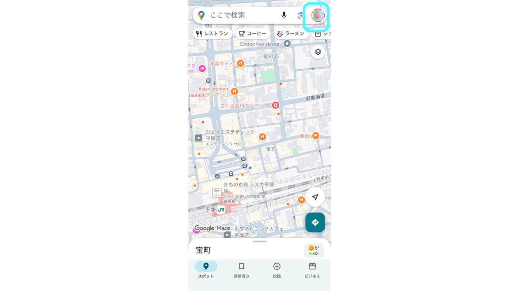 Googleマップを開き、右上、プロフィールアイコンをタップ