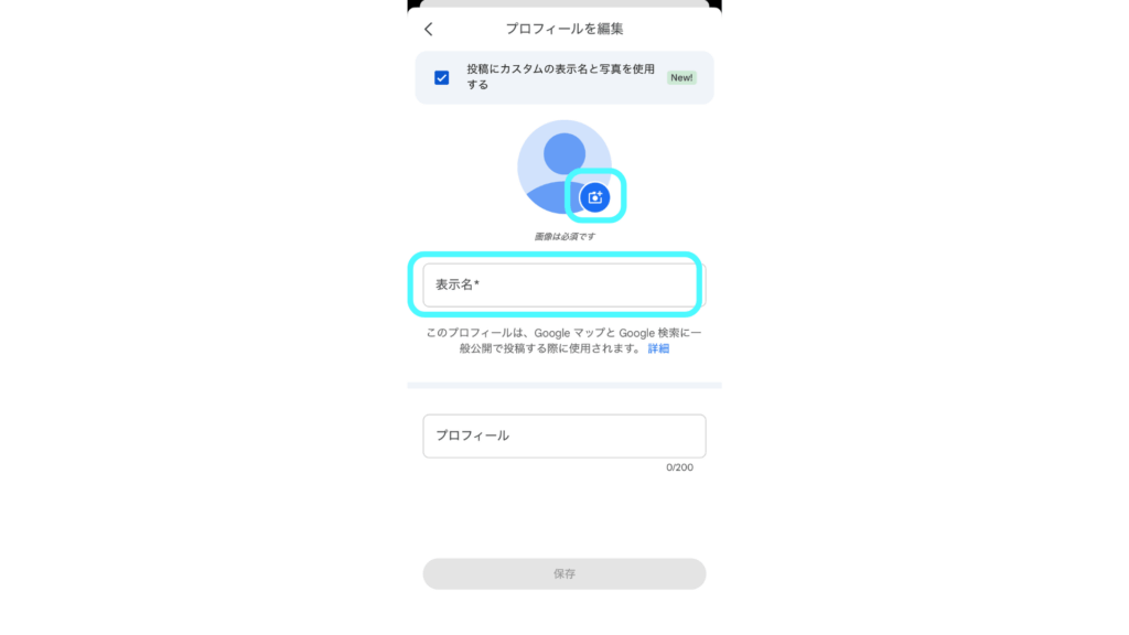 「投稿にカスタム表示名と写真を使用する」の左のチェックボックスをタップ